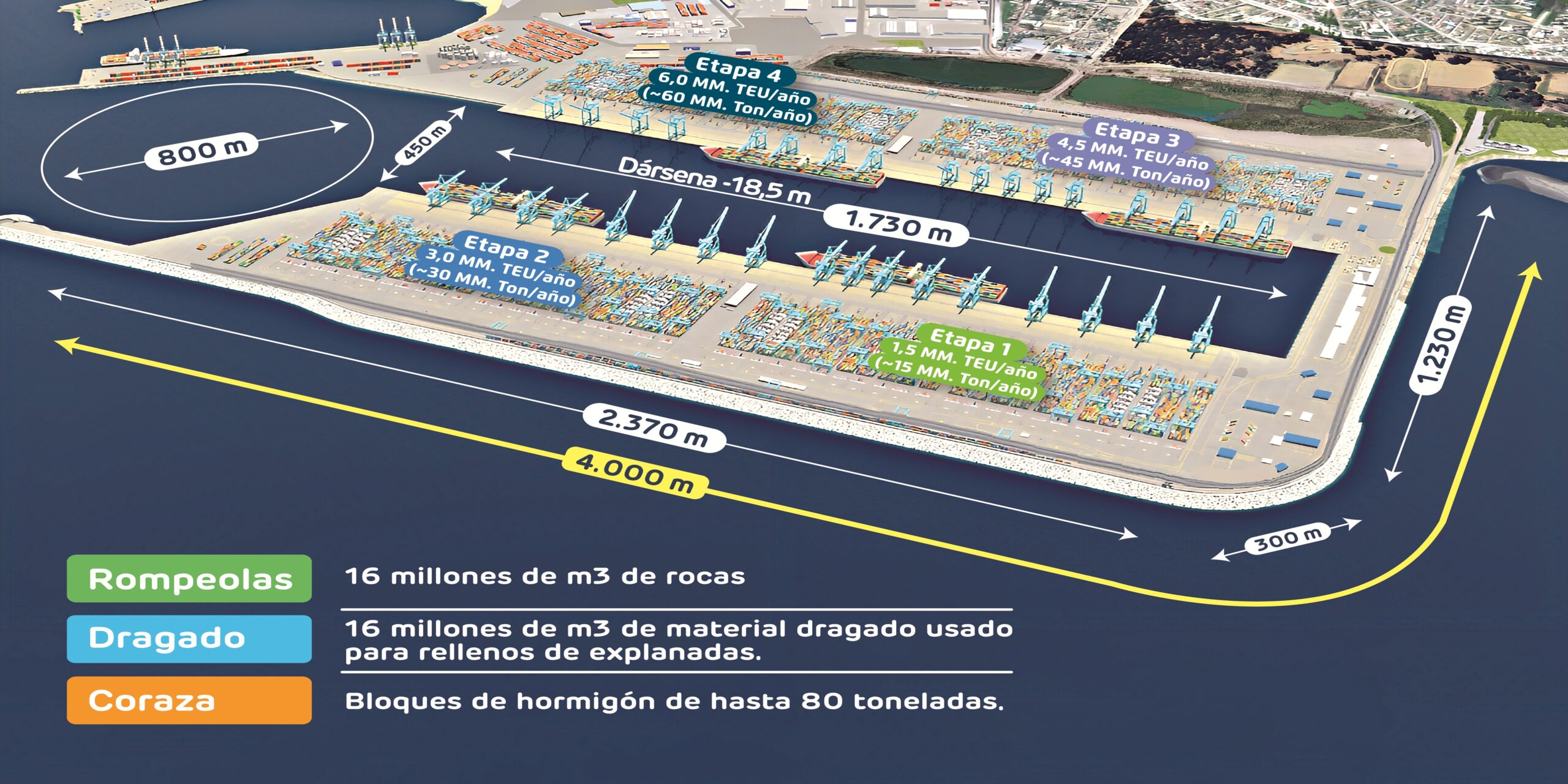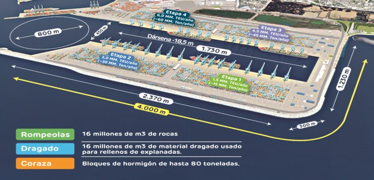 Puerto Exterior contempla la construcción de un molo de abrigo o muro rompeolas de casi 4 kilómetros de longitud, que tendrá dos terminales semiautomatizados de 1.730 metros cada uno, con capacidad para recibir, en forma simultánea, hasta ocho buques de 400 metros de largo, los de mayor tamaño que hoy navegan en el mundo.