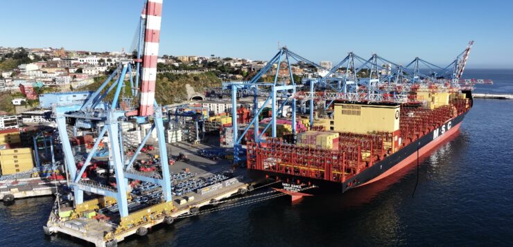 Es la nave más grande de esta línea naviera que llega a Valparaíso desde 2021, con 335 metros de eslora y 46 metros de manga.