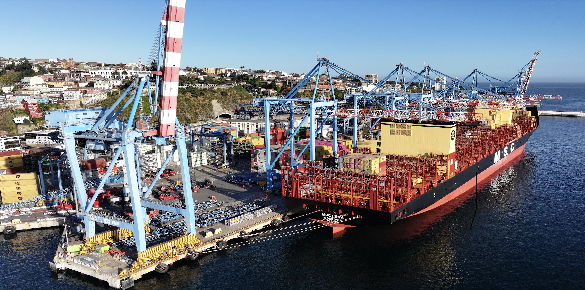 Valparaíso amaneció con la visita de un gigante: se trata de la recalada en Terminal Pacífico Sur Valparaíso del buque portacontenedores MSC “Edna”, el más grande de esta línea naviera que ha llegado a TPS desde 2021, y que por primera vez recaló en este puerto tras su construcción en agosto pasado.