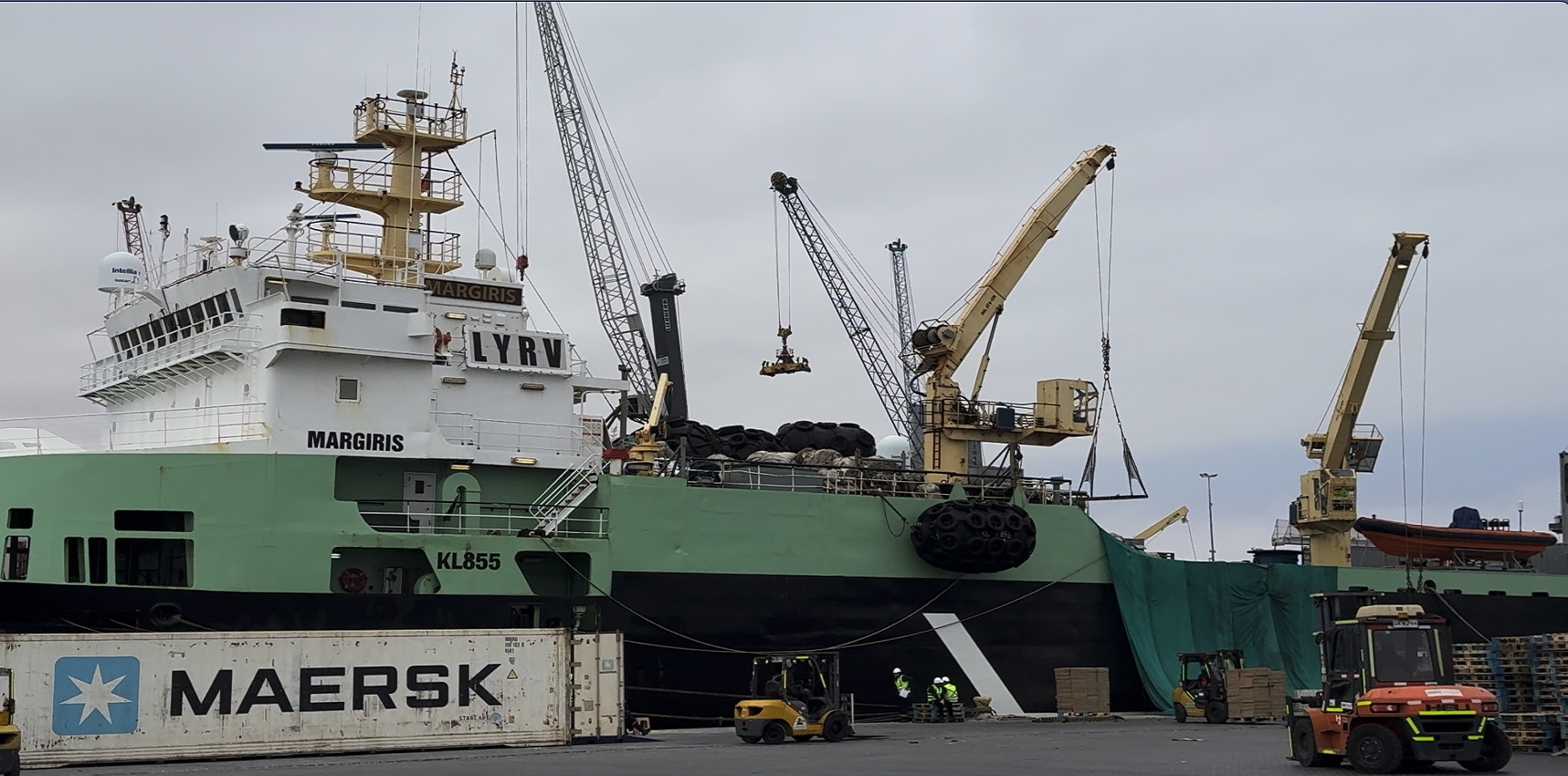 La carga proveniente del Margiris —principalmente compuesta por pesca procesada y congelada, específicamente jurel y caballa, capturada en aguas internacionales— será consolidada en contenedores y exportada hacia África, reafirmando la vocación exportadora y la conectividad internacional del recinto portuario.