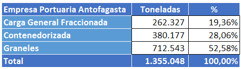 Las principales cargas transferidas por Empresa Portuaria Antofagasta son Contenedorizada y Graneles las cuáles alcanzan el 80,64% del total.