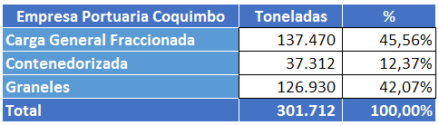 Las principales cargas transferidas por Empresa Portuaria Coquimbo son Carga General Fraccionada y Graneles las cuáles alcanzan el 87,63% del total.