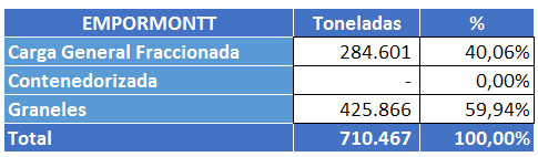 Las principales cargas transferidas por EMPORMONTT son Carga General Fraccionada y Graneles las cuáles alcanzan el 100,00% del total.