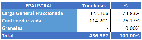 Las principales cargas transferidas por EPAUSTRAL son Carga General Fraccionada y Contenedorizada las cuáles alcanzan el 100,00% del total.