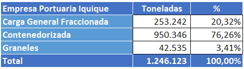 Las principales cargas de Empresa Portuaria Iquique son Carga General Fraccionada y Contenedorizada las cuáles alcanzan del 96.58% del total.