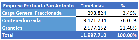 Las principales cargas transferidas por Empresa Portuaria San Antonio son Contenedorizada y Graneles las cuáles alcanzan el 97,51% del total.