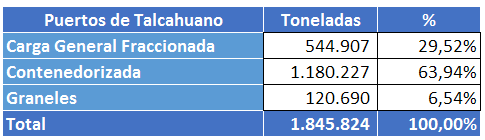 Las principales cargas transferidas por Puertos de Talcahuano son Carga General Fraccionada y Contenedorizada las cuáles alcanzan el 93,46% del total.