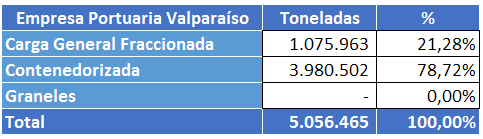 Las principales cargas transferidas por Empresa Portuaria Valparaíso son Carga General Fraccionada y Contenedorizada las cuáles alcanzan el 100,00% del total.