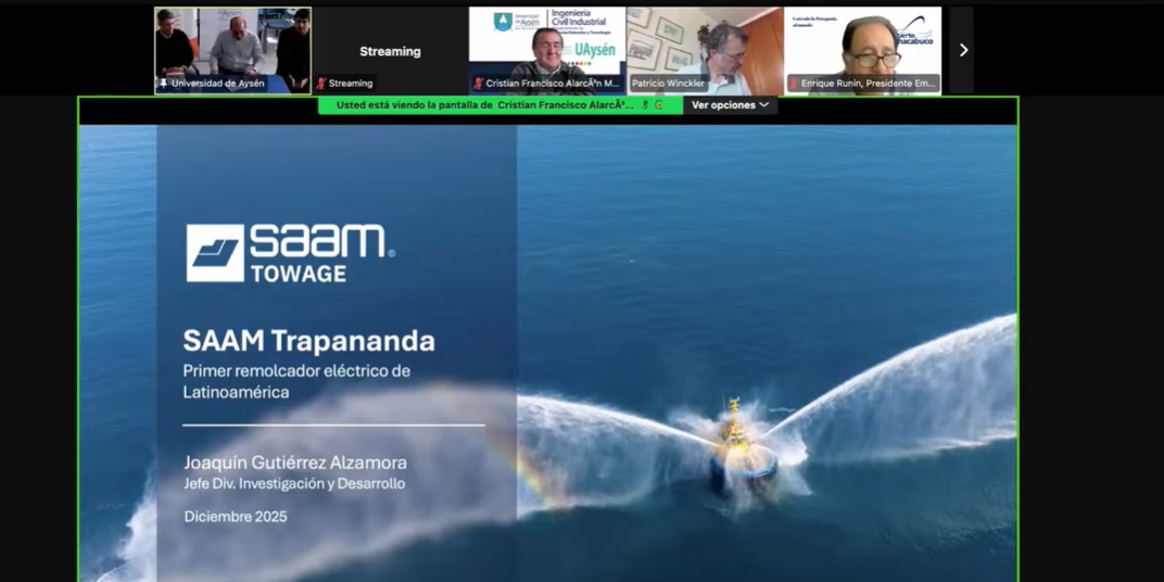 La primera exposición dio cuenta de uno de los proyectos más ambiciosos de la costa oeste sudamericana, como la puesta en marcha del primer remolcador eléctrico que presta servicios desde el segundo semestre de 2025 en Puerto Chacabuco e integrado a las operaciones de la Empresa Nacional del Petróleo (Enap) y que reduce cerca del 100% de CO2 respecto de la operación que se realizaba en la zona hasta su llegada, junto con disminuir el ruido ambiental y submarino entregando así una mayor protección para vida acuática del ecosistema.